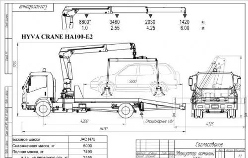 Эвакуаторная надстройка создана из легированной стали. Его элементы прошли специальную обработку в дробеструйной и окрасочной камере. Грузоподъёмность составляет 6 тонн. Погрузочная длина платформы – 5,2 м, габаритная ширина – 2,5 м. Минимальный угол заезда – 12 градусов. Механизм фиксации отличается высокой надежностью. Аппарели сдвигаются и раздвигаются для погрузки машин и оборудования.